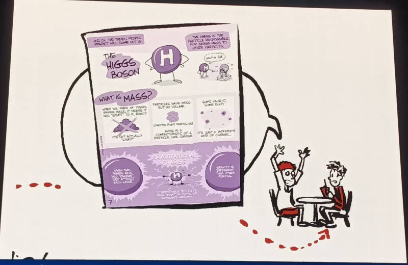 科学を伝える努力についてはさまざまなアプローチが行われてきたと説明し、ここではCERNの大型ハドロン衝突型加速器のFAQのマンガを紹介。このFAQでは中核的なことは何も伝えられておらず、ある意味説明を放棄した例として使われていた。