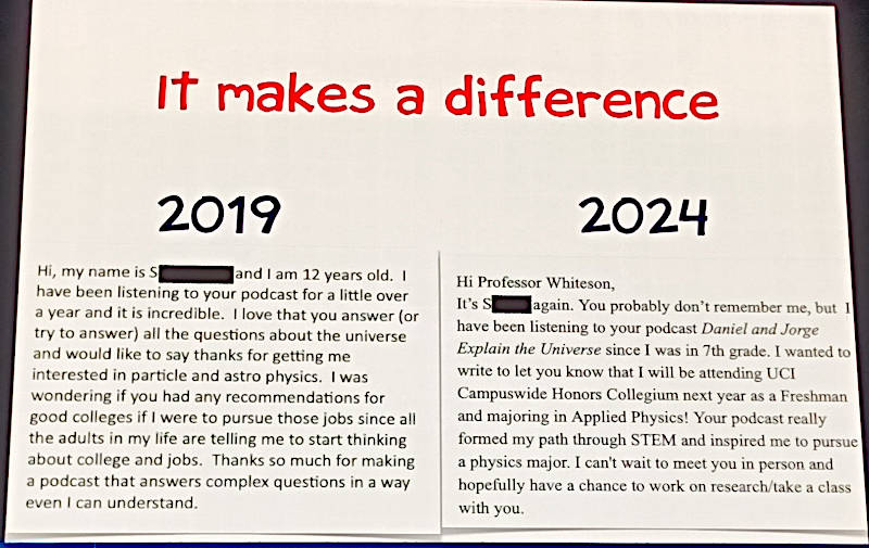 それを示すためにWhiteson氏のPodcastを毎日聴いていた12歳の少女が書いたメールを紹介。その少女は「教授のPodcastで興味を持った素粒子物理学についてどの大学を選べばいいのか?」と質問するメールを書いた5年後に、Whiteson氏が教授を務めるカリフォルニア大学アーバイン校に入学することを知らせるメールが届いたことを見せて、科学に対する素朴な疑問に答えるというコミュニケーションが結果的に一人の研究者を育てることに繋がったからだと説明した。