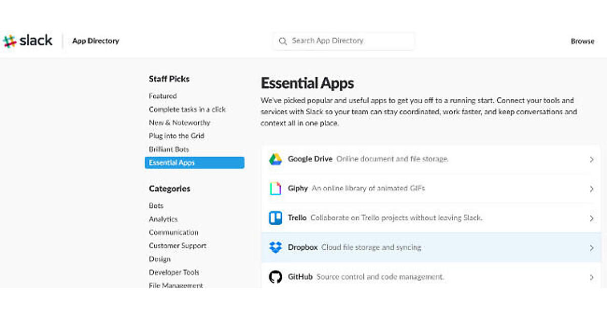 特に使いたいアプリが決まってない場合は、メニューから「Essential Apps」を選択して重要なアプリ(おそらく多くのワークスペースで使用されているアプリ)を参考にするといいでしょう。Google Drive、Trello、Dropbox、GitHub、Twitterなどのよく使われるサービスと連携するためのアプリケーションが表示されているのがわかります。