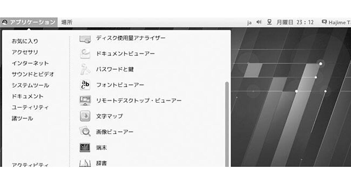 GNOME Shellが好みの方は、ログイン時にGNOME Shellに切り替えて使うこともできます。GNOME Shellでは「アクティビティ」という概念が新しく加わっているのが、操作上の特徴です。左上の[アクティビティ]をクリックすると、起動中のアプリケーションのウィンドウ一覧と、ダッシュボードが表示されます。アプリケーションを起動する場合には、ダッシュボードから選んで起動します。GNOME Shellは、デスクトップPCやノートPC以外に、タブレットPCでも操作がしやすいように設計されているインターフェイスです。