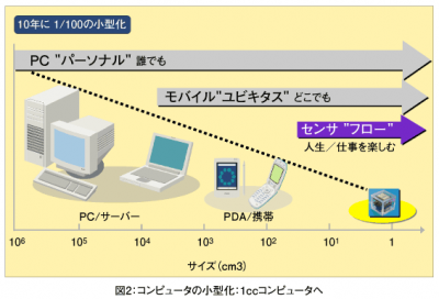 1つ目の変化は、コンピュータの小型化が次の段階へ進むことである。携帯電話は約100ccのコンピュータであるが、次の飛躍としてその100分の1の「1ccコンピュータ」が期待される(図2)。この時「意識しない」という価値が生まれる。これは1ccという大きさでは、キーボードによるデータ入力が不可能となるため、センサーが自律的に情報を取り込むことが必然となるからである。つまり、意識しなくとも、センサーがITへの情報の入り口になる。