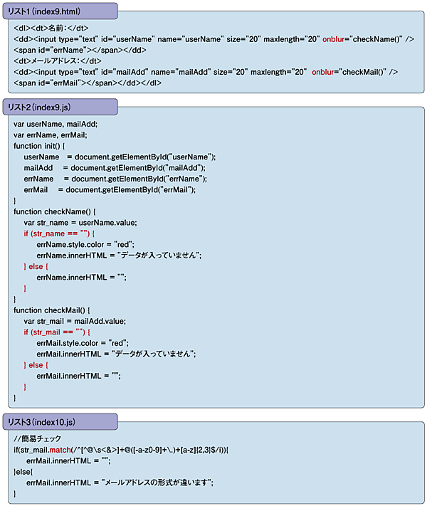 リスト2のJavaScriptでは、checkName()関数で、名前のチェック、checkMail()でメールアドレスのチェックをしていますが、この段階では、空欄(何も入っていない)かどうかのチェックをしてデータが入ってない場合に、エラーメッセージを赤文字で出力する処理をしています。innerHTMLプロパティを使ったHTMLへの書き出し方法は、第1回を参考にしてください。