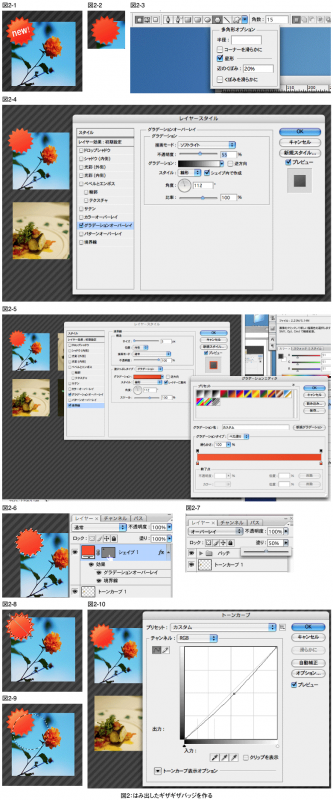 まずは、ツールバーの「多角形ツール」を使って、図2-2のようなギザギザの図形を描きましょう。「多角形オプション」で「星形」のチェックボックスを選ぶのがポイントです(図2-3)。