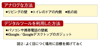 パソコンや携帯電話の壁紙はちょっとした画像編集ソフトで簡単に作れますし、携帯電話の待受画面に設定していればどこにいても見ることができます。また、iGoogleのガジェットに設定しておけば、家と会社で同じ目標を見ることができます。それぞれ、PCを利用したり携帯電話を利用したりするタイミングで、必ず目に入る場所です。24時間常に目に入る場所にある必要はありませんが、少なくとも週に一度は目にするような場所に目標を掲げておくと効果は高いと思います。