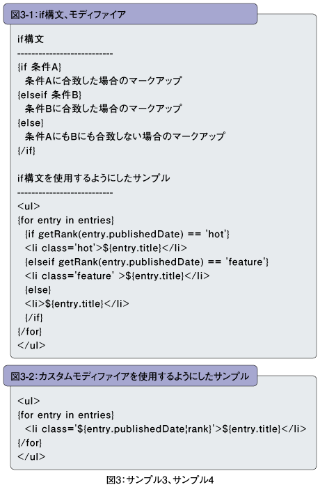 このように条件に応じてマークアップを変更させるには、if構文を使用することができます。図3-1にif構文と、今回のサンプルのテンプレートを示しました。