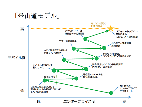 その上でそれらの落とし穴を回避する方法論として「ガチガチのエンタープライズ企業がいきなり組織や方法論をまるごと変更してモバイルアプリケーションの開発に移行するのは危険」であるため、一度、モバイルアプリ開発チームを小さく独立させてから、開発を進める「登山道モデル」を推奨した。これはエンタープライズのIT部門からアジャイル開発を行うチームを独立させ、開発環境もルールも別枠でスタートさせて徐々に企業が持つ本来のコンプライアンスに統合していく方法論だ。