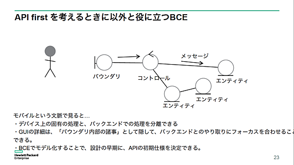API Firstとは「構成要素間のコラボレーションとAPI仕様を先に定義し、個々の要素の実装を並行して開発するプラクティス」だ。クラウドネイティブな外部サービスとの連携だけではなく、社内の他のシステムとの連携を分離するために応用出来るという。つまりバックエンドを受け持つサービスとフロントエンドのモバイルアプリにおいて如何にビジネスロジックやデータを分離するのか? に適応可能な発想になる。大元はラショナルソフトウェアのRational Unified Prosess(RUP)から出てきた業務プロセスを分析する方法としてBCE(バウンダリ・コントロール・エンティティ)モデルを使い、モバイルアプリのGUI、バックエンドとのやり取りをクリアにしたうえで、各システム間の接続ポイントをAPIとして定義することで設計の早期の段階で開発を並列化することが目的だという。