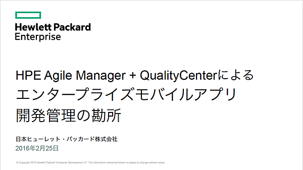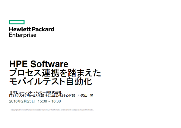 最後に登壇したのは、同じく日本ヒューレット・パッカード株式会社ソフトウェア事業統括 シニアコンサルタントの小宮山晃氏だ。小宮山氏は、モバイルアプリケーション開発における日本ヒューレット・パッカードの提供するソリューションとして、開発フェーズ、結合テスト、システムテストそれぞれの段階におけるテストの難しさと必要性、HPEのテストツールの連携などについて解説を行った。