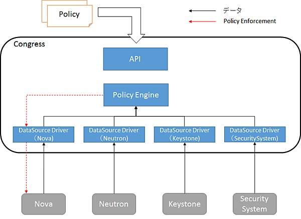 このようなPolicyは、従来は個別モジュールに対する作りこみであったり、場合によっては人によるチェックにより運用されてきました。しかしクラウドシステムの規模が大きくなり、複数の多様なシステムがクラウド上で動くようになると、このPolicyの運用を自動化したくなります。Congressはそのために開発されているプロジェクトです。