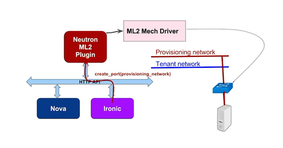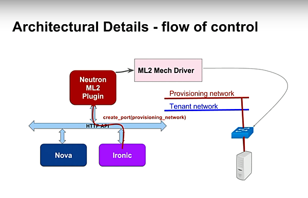 この機能についてカンファレンスでセッションがあり、どういうやり方で実現しているか、詳細な説明がありました※1。ポイントは、ベアメタルマシン準備に伴う接続ネットワークの切り替えと、Neutronへのスイッチ接続情報の通知の2点です。
