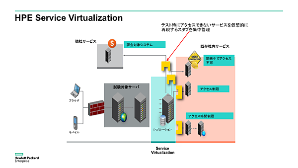そこで、ポイントとなるのが、1つ目の仮想化である。揃っていない(利用できない)サービスを仮想化、つまり、あたかもそこに存在するかのような状態を作り出し、システムを結合した状態のテストを前倒しで行う、という対策である。一般的な方法としてはスタブの作成を思いつく方も多いだろう。しかし、ここにも課題がある。例えば、開発作業中にスタブを作ること自体が工数をとられることにもなるし、限りある時間の中では簡易なものとなってしまい現実と乖離してしまう可能性があるのだ。また、複数の開発現場でスタブ用のサーバが乱立することでその運用コスト、メンテナンスコストも膨らんできてしまう。近年こうした課題を克服する仕組みが登場し始めている。例えば、HPEが提供する外部サービス仮想化ツール「HPE Service Virtualization」を利用すると、様々な外部システムやサービスを効率的に仮想化でき、テスト時に大きな効果が見込めるのだ。