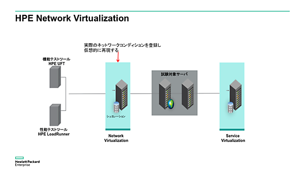 「HPE Network Virtualization」のサーバに、測定したネットワークコンディションを設定して、テスト対象のアプリケーションにアクセスする。ネットワーク品質を高精度で再現し、テスト対象アプリケーションの機能や応答性を正確に確認できる。