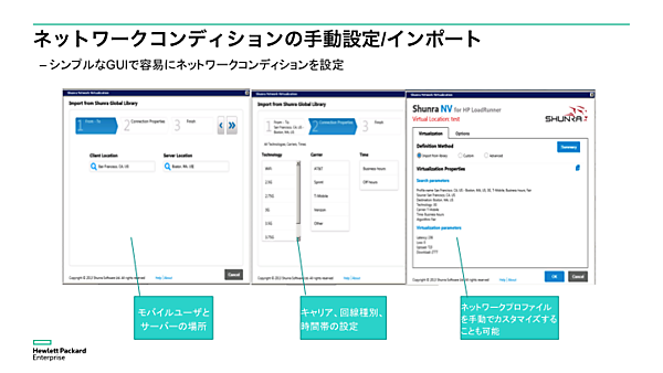このような問題点の発見やその結果による対応策等を考えるにあたっても現実のネットワーク速度でテストすることが重要だとわかる。しかし、大量のモバイル端末を用意してテストを行うのは現実的ではない。そこでポイントとなるのが、2つ目の仮想化である、ネットワークの仮想化だ。HPEが提供するネットワーク仮想化ツール「HPE Network Virtualization」では、帯域幅や遅延、パケットロスといったネットワークコンディションを、LAN環境の中で設定してテストが可能になる。このソリューションでは、利用キャリア、アクセスする場所、端末などの情報が既存で設定されていて、さまざまな試用ができる。つまり、仮想的にモバイル環境からアクセスしている状況を社内で構築してテストできるのだ。さらに負荷テストツール「HPE LoadRunner」や、機能ストツール「HPE UFT」などと連携し、ネットワーク品質を考慮した状態で性能テストや機能テストを実現することができる。