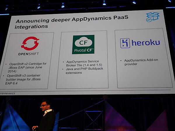 まずバンサル氏は、新しい機能としてPaaS統合を紹介した。Red Hatが推進するOpenShiftとのインテグレーション、Pivotalが推進するCloud Foundryとのインテグレーション、さらにSalesforceのPaaSであるHerokuとのインテグレーションを紹介し、モダンなアプリケーション開発スタイルであるPaaSにおいてもモニタリングソリューションを組み込むことが容易に可能になったことを解説した。