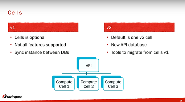 しかし、Cells v1はnova-cellsという独自コンポーネントを必要とし、それがNovaの進化についていけないという問題やNeutronやCinderとの連携ができないなど様々な制限事項がありました。そのため1年ほど前からCellsをどうしていくかという議論があり、結論としてCells v2を作り、Cells v2自体をNovaのデフォルトにすることになりました。つまり、Nova自体がnova-cellsを取り込み、通常の使い方はCellが一つしかない状態という見え方になります。今回のサミットの議論の結果としては、Cells v2はMitaka Priorityに入り、NovaコミュニティとしてMitakaリリース(2016年4月リリース予定)に向けて優先度を高くして取り組むということになりました。また、複数Cell構成ですが、Mitakaの次のNリリースで実現し、Cells v1からCells v2への移行についてはNリリースよりも後に取り組むというようなロードマップとなりました。