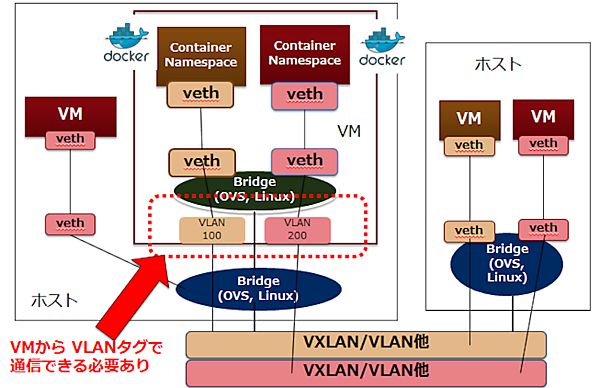VM上にDockerをインストールする場合は、コンテナのNamespaceをVM内のブリッジに接続するところまではベアメタルの場合と同じですが、VMから外部に出て行く場合には1つのNIC経由で出て行くため、各コンテナが異なるネットワークに属している場合には区別をしてやる必要があります。そのため、VMからの出力時にVLANタグを使用してネットワーク識別を行います。ホスト側のブリッジでは、VMからのパケットのVLANタグを基づいてNeutronネットワークへのマッピングを行います。このVMからのパケットのVLANタグに基づいたNeutronネットワークへのマッピングを行う機能として、前述したVLAN-aware VM機能が開発されており、この機能の実現が待たれます。