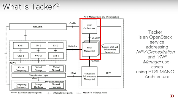 Tackerは、NFVの領域の新しいプロジェクトであり、ETSIで作成されたNFVアーキテクチャにおけるNFV OrchestratorとVNF Managerをカバーするものです。Tackerはもともとは仮想アプライアンスの制御サービスとして約1年半前に開始されたプロジェクトで、前回のバンクーバーサミットの少し前からNFVの面を全面的に押し出す方向にシフトして来ました。コミュニティも小さく、まだデモができるようになったレベルですが、特にNFVの領域では注目を集めており、今回のTokyo Summitで行われたTackerのBoF(Bird of Feather)は部屋を溢れるほど人が集まっていました。