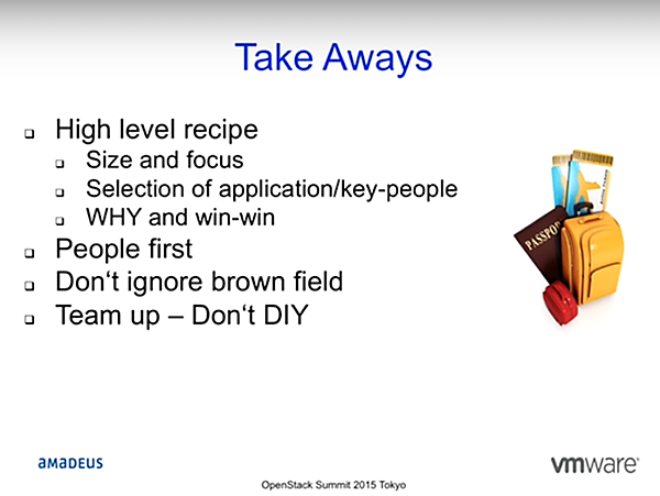 ユーザにいろいろと強いているようですが、必ずしもユーザだけで考えろと言っているわけではありません。パートナーやチーム作りが重要になります。ベンダーやディストリビュータ、インテグレータの力を借りて、チームを組んで取り組むということです。Summitのユーザ事例でも、”Team up - Don’t DIY”というフレーズが出ていました3。
