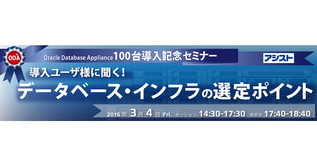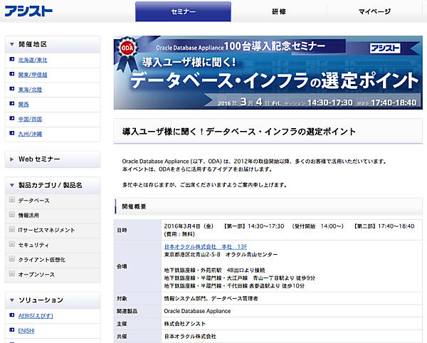 株式会社アシスト主催のOracle Database Applianceに関するセミナーが3月3日、都内の日本オラクル本社で開催される。現行システムの課題や背景から、選定ポイント、運用ノウハウ、コストに対する考え方まで、Oracle Databaseを利用しているユーザーにとってためになるノウハウ満載のセミナーだ。