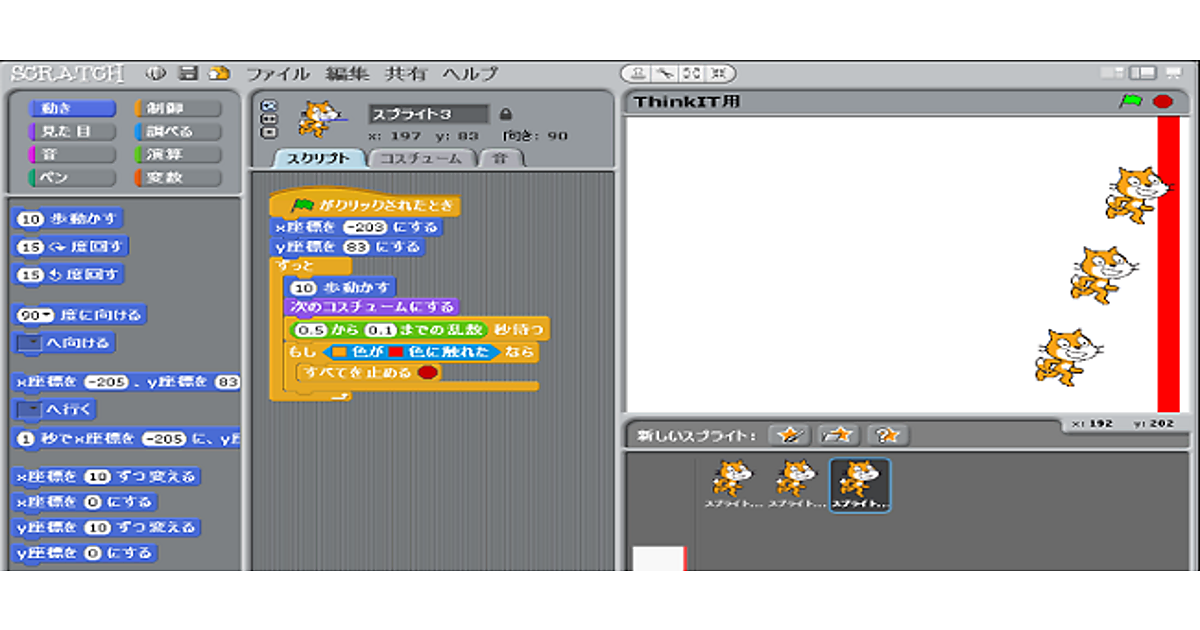 図6のスクリプトを実行すると、スプライト1の猫は右端まで歩いて立ち止まっているように見えますが、実際にはまだ動いている状態です。この場合は同じスピードで動いています。ここで、歩くスピードをランダムに変える処理を追加してみましょう。