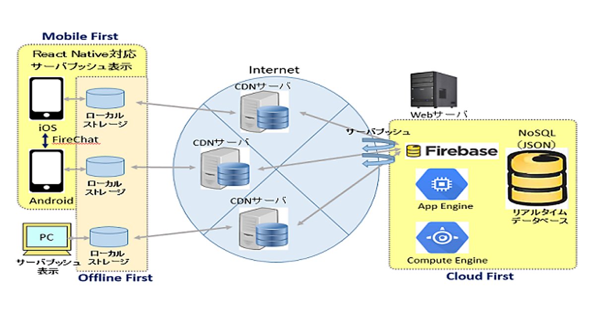 スマホやPCから書き込まれたデータはローカルストレージに保存された後、サーバに送信されます。このとき、もしネットワーク障害が発生してもデータはローカルに保存され、ネットワークが復帰次第サーバに送信されて通常のFirebase処理を継続します。またFireChatを使用するとネットに接続しなくても近距離(約60m)のスマホ同士でメッセージをやり取りできます。