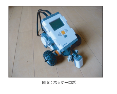 まず、制御対象となるロボットを作成しましょう。教育用レゴ マインドストームNXTの基本セットには、ホッケーロボと呼ばれるロボットの組み立て図が入っています。この組み立て図を参考にしながら、ロボットを作ります。およそ1時間で作れると思います。