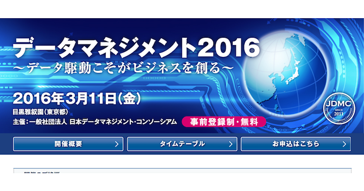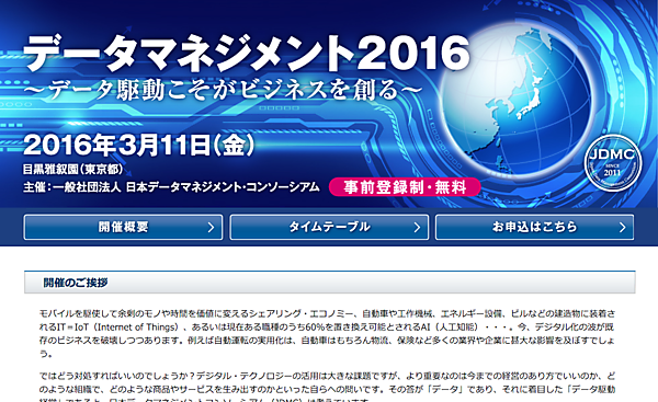 一般社団法人 日本データマネジメント・コンソーシアム(以下、JDMC)主催の日本最大規模のデータ専門カンファレンス「データマネジメント2016」が、今年も3月11日に開催される。