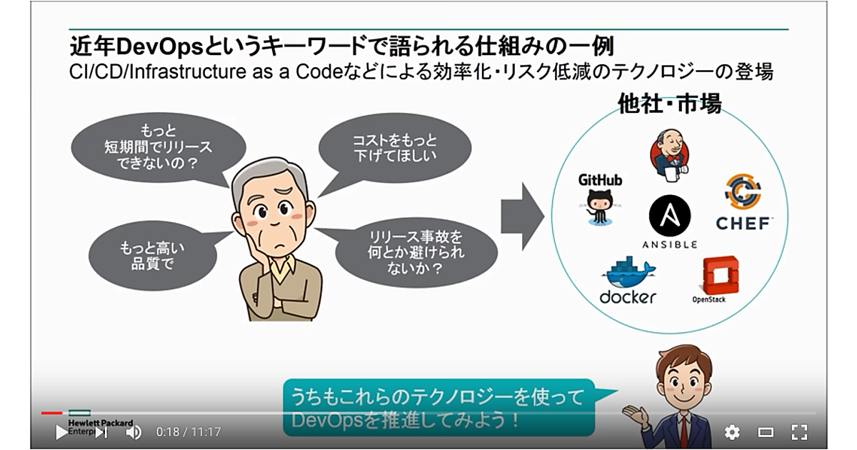 HPEでは、Runbook Automationの分野を10年以上リードしてきたノウハウを元に、マルチベンダー、ヘテロジニアスなリソースプールより、必要なリソースを切り出して提供するテンプレートを多数提供している。また、ChefやPapet、Ansible等の成果物を取り込み一元的に管理したり、CIツールのJenkinsと統合することで、インフラのプロビジョニング~アプリケーションのデプロイメントまで自動化したりできる。
