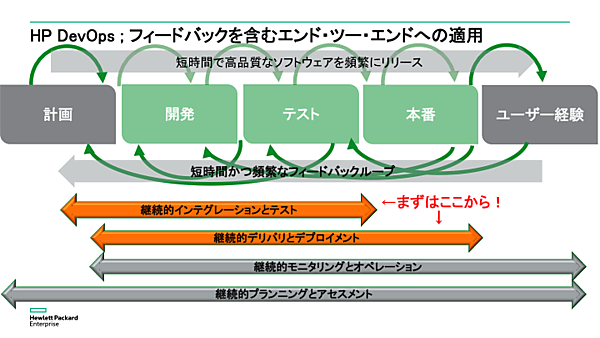 ITがビジネスに大きく貢献するために必要とされているDevOpsだが、こうした多くの課題を抱えている中では一足飛びに実現できないのが現実だろう。そこで日本HPEでは、開発~結合テストの領域に区切って短縮化することで社内の課題を解決し、誰もがDevOpsの第一歩を踏み出せるような“リーズナブルなDevOps”のはじめ方を提唱している。