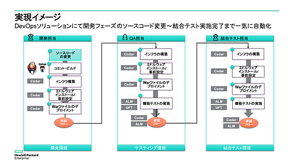 そのため、HPEのソリューションではコードの変更から、インフラ環境のプロビジョニング、デプロイメント、更に対応するテストまでも自動実行し、開発〜テストフェーズを横断しながらプロセスを一気通貫で管理しているのだ。