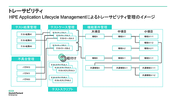 テストを自動化するにも、実装する機能に対して実施するテストケースがマッチングできなければ、DevOpsのワークフローに取り込むことができない。どの機能を変更したらどのテスト項目を実施すべきなのか、そのテストの結果や検出した不具合を可視化することが重要だからだ。HPE Application Lifecycle Managementでは、こういったトレーサビリティを可視化し、テストケースにマッチする自動化されたUFTなどテストスクリプトを紐付けることができる。 Codarと同様に、既存で使っているOSS等を使っても良い。
