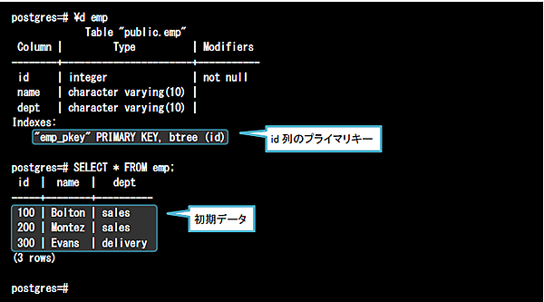 以下のデータがロードされているempテーブルを用いて、それぞれの振る舞いを確認してみましょう。なおempテーブルはid列がプライマリキーとなっており、ユニークな値のみが挿入可能な一意制約が定義されています。