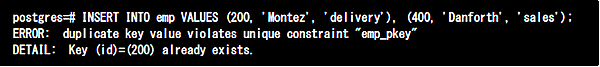 次のようなINSERT文を実行すると、これまではid=200の列が一意制約違反となり、エラーとなって終了していました。