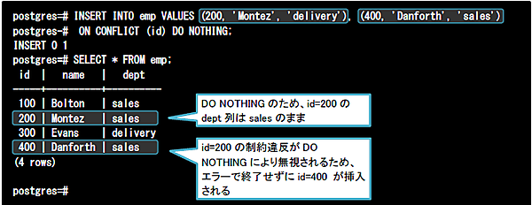 以下はDO NOTHING句を利用した例です。id=200の列は既にテーブルに存在するため、対象行への処理は何も行われずに(エラーとならずに)完了します。一方、id=400の列はテーブルに存在しないため、通常の挿入処理が実行されます。