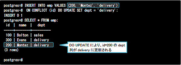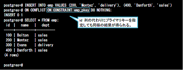 このON CONFLICT句の機能によって、データがまだ存在しない場合は挿入、データがすでに存在する場合は更新といった差分更新をデータベース管理者でも容易に実現できるようになります。これまでは、この仕組みを実現させるためにアプリケーション側などで複雑な処理を設計する必要がありました。