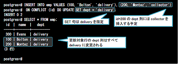 DO UPDATE句でVALUES句に2つ以上の値を指定している際は注意が必要です。以下の例では、VALUES句に2つの値を指定しており、id=200のdept列にcollectorを挿入しようとしています。しかし、DO UPDATE文のSET句で指定されているのがdeliveryであるため、すべての更新行のdept列がdeliveryの値に変更されてしまいます。