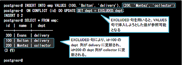 そこで、このような場合はEXCLUDED句を利用します。EXCLUDED句を用いるとVALUES句で指定した値をSET句で参照できるようになり、行ごとに更新したい値を変更できるようになります。