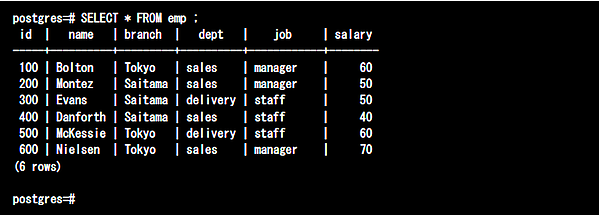 以下のデータがロードされているempテーブルを用いて、それぞれの振る舞いを確認してみましょう。