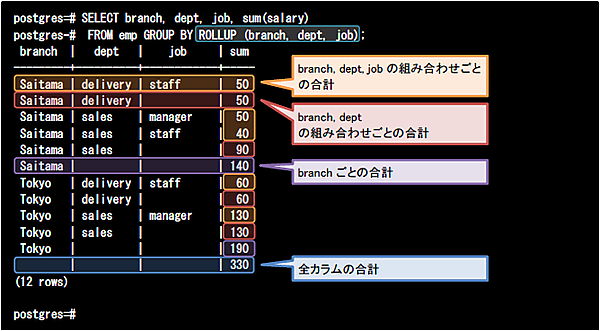 ROLLUP句では指定したカラム順に小計値を求めることができます。以下のクエリでは、ROLLUP句にbranch, dept, job列の順に指定しています。