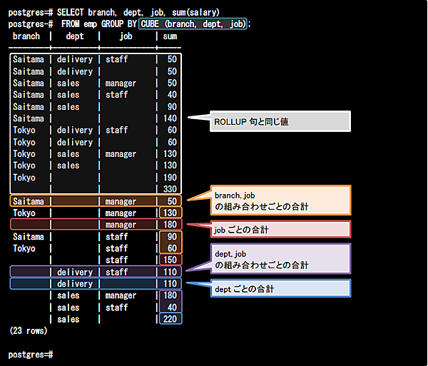 CUBE句では指定したカラムのすべての組み合わせで小計を求めることができます。以下のクエリでは、CUBE句にbranch, dept, job列の順に指定しています。このクエリを実行すると、最初にROLLUP句で指定した組み合わせと同じ値が導出されます。