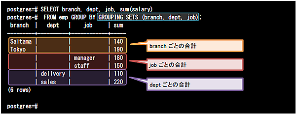 このクエリを実行すると、branchごとのsalary列の合計(橙色の値)、jobごとのsalary列の合計(赤色の値)、deptごとのsalary列の合計(紫色の値)を導出できます。