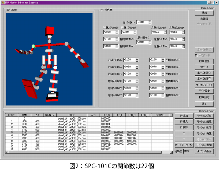これに対してSPC-101Cは、RS-485の半二重通信によるマイコン内蔵・コマンド型のサーボモータを主に使用しています。関節自由度は22、うち20個はコマンド型サーボです(図2)。