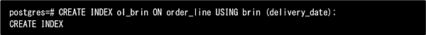インデックスを作成するorder_lineテーブルのdelivery_date列には、1秒間隔のタイムスタンプ型のデータが昇順に約6,300万件(約2.6GB)格納されています。データは昇順にロードされており、物理的にも整列されている状態です。このdelivery_date列にインデックスを定義します。BRINインデックスは通常のインデックスと同様にCREATE INDEX文で定義できます。