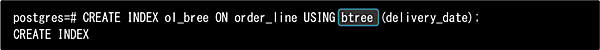 B-treeインデックスの定義方法は以下のようになります。なお、インデックスのタイプを指定しない場合はデフォルトでB-treeインデックスが作成されます。