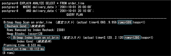 この例では、ol_brin BRINインデックスを利用してビットマップ・インデックス・スキャンで対象行を取得しています。ここで上記スキャンのactual rows(実際の取得行)が1,280行であることに注目してください。最終的に取得したい件数は599件ですが、それよりも多くの行を取得しています。これは、BRINインデックスが「グループの最大値と最小値」という範囲で対象行を絞り込み、検証対象外の行も含めてグループ範囲内のすべての行を取得していることに起因します。このため、BRINインデックスを利用して検索した後に検索条件を再チェック(Recheck Cond)し、最終的に合致するタプルを絞り込んでいます。