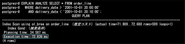 続いてorder_lineテーブルにANALYZEを実施後、EXPLAIN ANALYZE文で実行計画と実行時間を確認します。下記はBRINインデックスを用いた場合の実行計画と実行時間です。