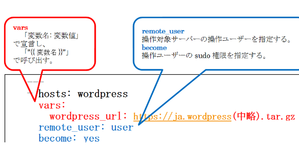 「vars」で指定しているのは変数です。環境やユーザーによって異なる値が必要となる場合のために、Playbookの冒頭で設定しています。今回のPlaybookでは、WordPressのダウンロード先となるURLの指定に変数を利用しています。これは、バージョンアップなどによりダウンロード先URLが変更されることがあるためです。他には、ユーザー名やパスワードなど、環境に応じて異なる値を入れる場合などに設定しておくと便利です。