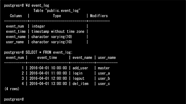 以下に定義されたevent_logテーブルには、全ユーザのイベント(操作)のログが蓄積されています。