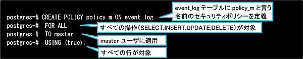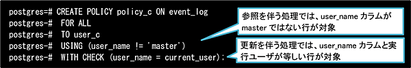 「master以外のログが参照可能」という定義はUSING句で行っています。USING句は参照処理(SELECTやUPDATE、DELETEの参照処理も含む)のみに適用される構文、言い換えれば既存行の評価のみを行う構文です。そのため、「自分自身(user_c)のログを更新可能」という更新処理に関する定義はWITH CHECK句で行います。WITH CHECK句は、更新処理(INSERTやUPDATEなど)のみに適用される構文、言い換えれば新規行の評価のみを行う構文です。