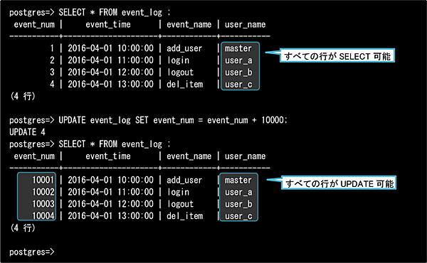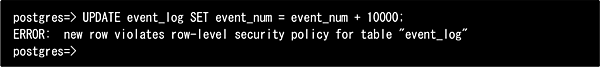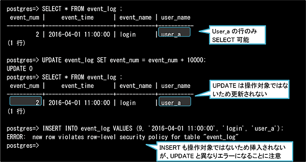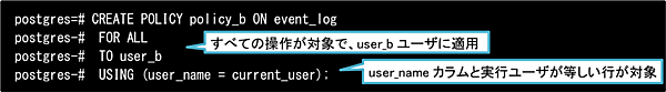 ここで、 (3)のuser_bの定義(自分自身のログのみ参照・更新可能)を思い出して、「WITH CHECK句が存在しない」と疑問に思った方がいるかもしれません。(3)のuser_bはWITH CHECK句の定義がないため、代わりにUSING句のセキュリティポリシーが新規行の評価に適用されているのです(ただし、これが適用されるのは対象操作がALLとUPDATEの場合のみです。対象操作がINSERTであるにもかかわらずWITH CHECK句が存在しない場合は定義の段階でエラーとなります)。